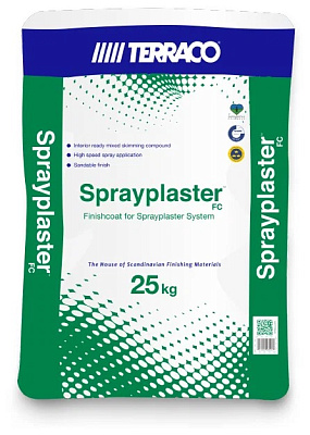 Спрейпластер FС - готовая к применению тонкослойная шпатлевка белого цвета на акриловой основе для окончательной подготовки поверхности под окраску и нанесение любых декоративных покрытий. Спрейпластер FC является элементом системы шпатлевок Террако Спрейпластер. Спрейпластер FС специально разработан для возможности его механизированного нанесения.